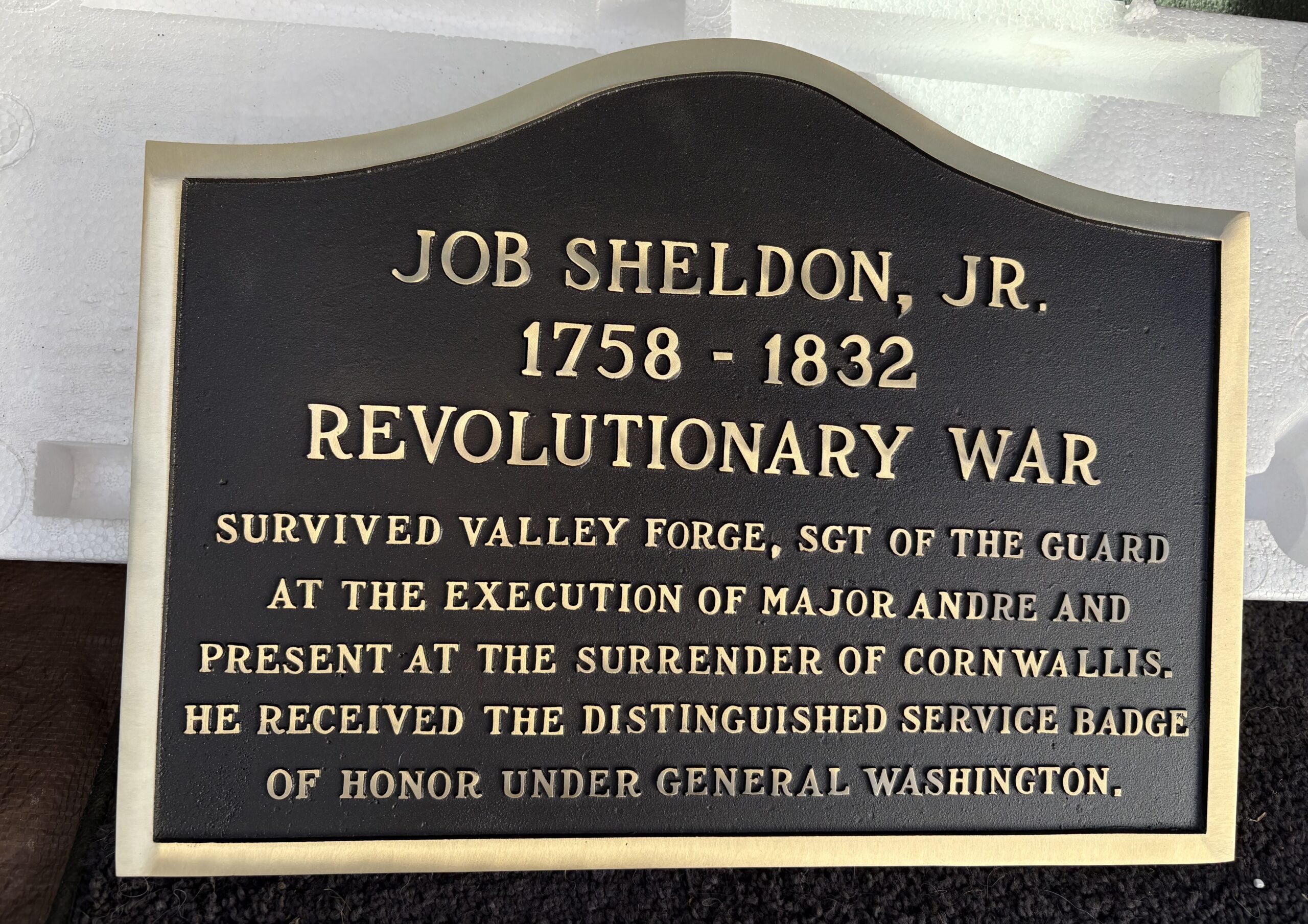 Job Sheldon was born in Cranston, RI Jan 26, 1758 and died in Delhi, NY April 1, 1832. He married Hannah Crawford Tripe (1763-1831) on Sept 28, 1783 in Palatine, Montgomery Co, NY. Job Sheldon was 18 years old when the Revolution began. His war record includes his survival at the siege of Valley Forge, the defense of Forts Mifflin and Mercer, for which he was awarded the badge of honor from Gen. Washington, the Battle of Monmouth, he was a Sgt. of the Guard at the execution of the British spy, Major John Andre, and he was at the Battle of Yorktown when Cornwallis surrendered. Mr. Sheldon was a loyal patriot and continued to fight for his country when he joined the Army during the War of 1812.